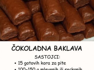 Za baklavice:– 15 gotovih kora za pite– 100-150 g mlevenih ili seckanih oraha– 250 g margarina– 200 g cokolade za kuvanje– 6 kasika ulja– oko 120 g nekog cokoladnog namaza tipa nutella ili eurokrem (samo […]