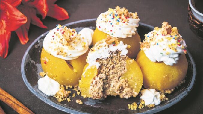 Pečena jabuka punjena orasima i šlagom, prelivena karamel sosom. Tradicionalni desert s primesama istočne kuhinje.